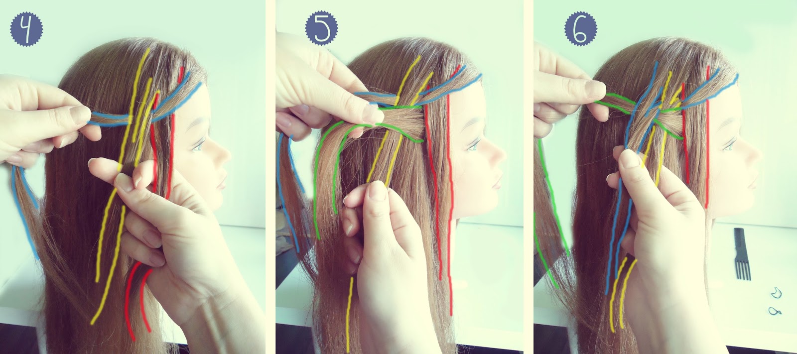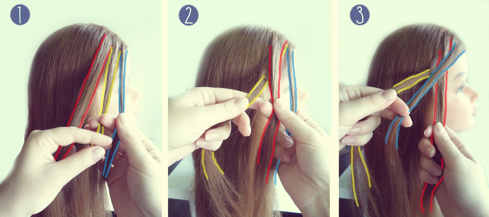1. Wybieramy pasmo włosów znad skroni i dzielimy na 3. Każde pasemko oznaczyłam innym kolorem, żeby łatwiej było je śledzić.