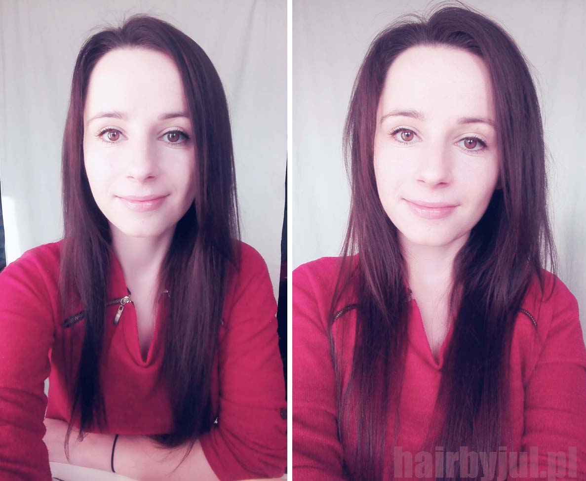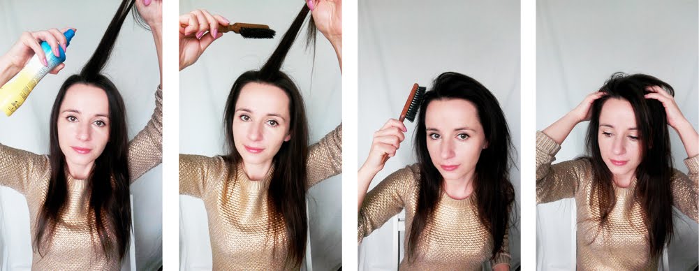 Pryskamy nim włosy u nasady, przeczesujemy i delikatnie, delikatnie tapirujemy u nasady pasmo po paśmie. Nawet może nie nazwałabym tego tapirowaniem- po prostu każde pojedyncze pasemko przeczesujemy szczotką przy nasadzie RAZ, w kierunku przeciwnym do wzrostu włosa. A potem przeczesujemy, żeby wygładzić.