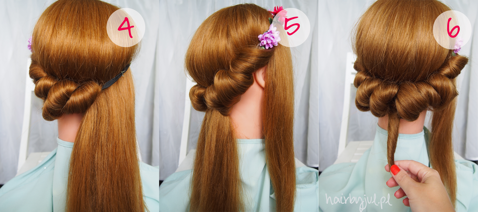 6. Końcówki skręcamy razem i przewijamy przez opaskę tyle razy na ile starczy włosów. Na koniec możemy zabezpieczyć końcówki wsuwką, żeby fryzura mocno się trzymała.